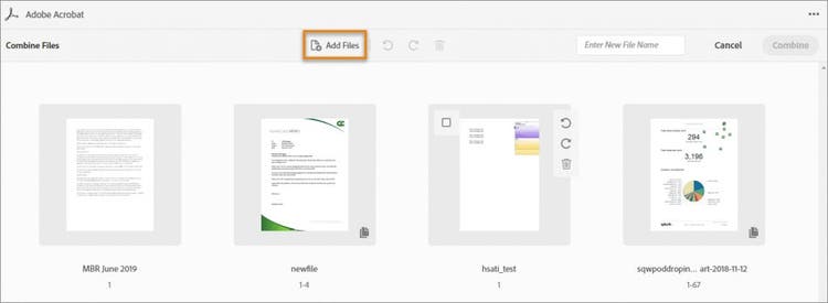 - Na janela de visualização da Document Cloud, selecione Editar >combinar arquivos.