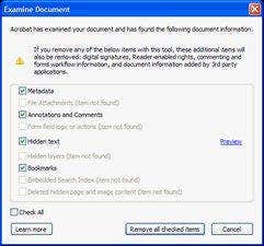 Fortunately, Acrobat 8 adds a new feature called Examine Document which eliminates hidden text and other metadata from PDFs. Examine Document is available in both Acrobat 8 Standard and Professional.