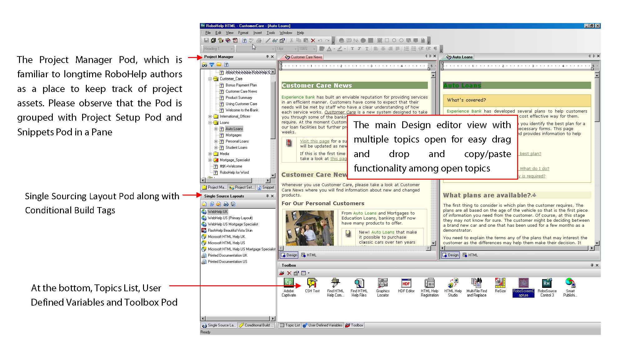 Let’s now take a detailed look at Adobe RoboHelp 7’s UI (as shown in the illustration above)
