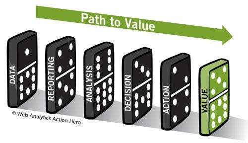 Most companies have abundant reporting but may be missing the “analysis” domino. Reporting will rarely initiate action on its own as analysis is required to help bridge the gap between data and action. Having analysis doesn’t guarantee that good decisions will be made, that people will actually act on the recommendations, that the business will take the right actions, or that teams will be able to execute effectively on those right actions. However, it is a necessary step closer to action and the potential value that can be realized through successful web analytics.