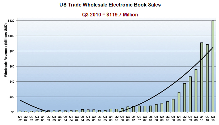 The IDPF collects quarterly US trade retail eBook sales in conjunction with the Association of American Publishers (AAP). For details on the AAP’s statistics program, please refer to the AAP website. The IDPF has aggregated quarterly statistics from the AAP’s program and earlier IDPF statistics program represented in this graph.