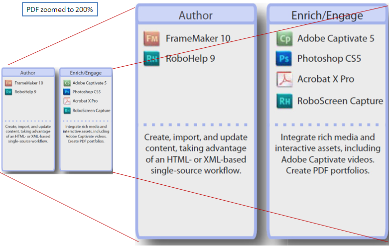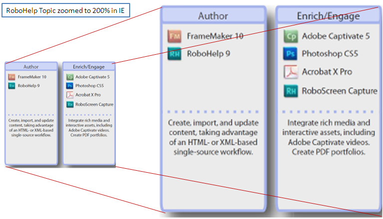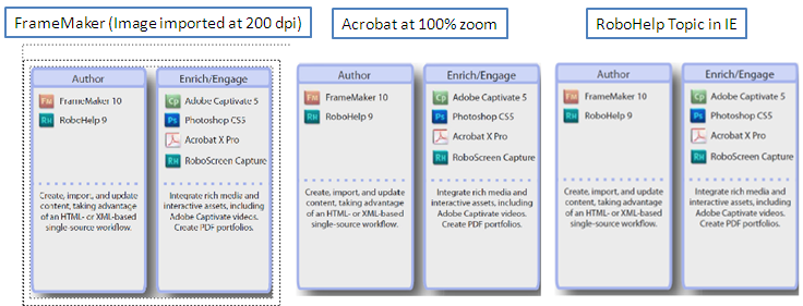 However, a similar functionality is not available in the online(web) world when the HTML is viewed in a browser. Browsers do not do a very good job of scaling images. RoboHelp understands this limitation of browsers and recreates the image at the resolution mentioned for the image in FrameMaker while importing the image. The recreated image does not contain extra pixel values as that present in the original image. Thus, when the image at normal size in a browser is compared to the scaled up in an image in a PDF, it looks degraded in quality though they more or less look same when viewed at the same zoom value.