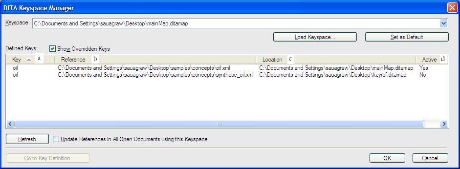 Thus, using Keyspace Manager, you can figure out where each key is pointing to and should assist in debugging when creating links and references using keys. Also, you can select any key from the list and go to its definition directly using the option “Go to Key Definition” from the dialog box.