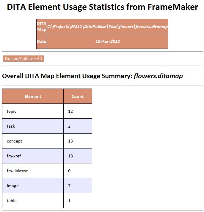 One contains the information on each individual topic component of the map and the other one at the end aggregates the information for the entire DITA Map. Initial view of the HTML report has all individual topic section in collapsed state and the overall summary is presented. You can choose to expand the individual topic section by clicking the “Expand/Collapse All” button on the report.