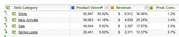 For example, an analyst can run the “Web Category” report and see the revenue breakdown for products purchased from those categories. The site merchants that created these categories use this information to understand category performance, and optimize their them for maximum revenue.