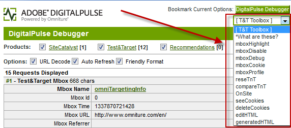 The most basic and powerful change was simply to roll up all of the obscure query string parameters and other tools into one place. In the upper-right hand corner you will see a dropdown menu called “T&T Toolbox” with many of your old favorites like mboxDisable, mboxDebug, mboxCookie, and mboxProfile: