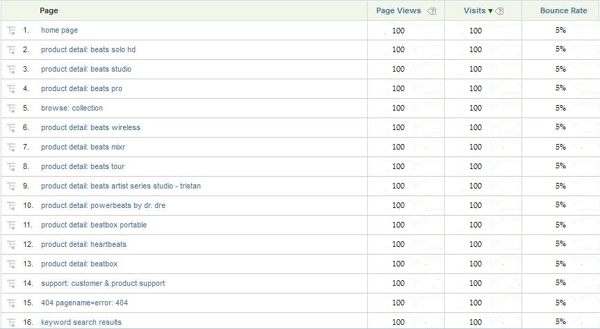 beatsbydre.com is a relatively straightforward site and thus, its SiteCatalyst users don’t require a lot of context to the pageName values in order to understand and interpret the data. This serves the company’s purposes perfectly but for sites that have a large number of departments, categories, and subcategories, the pageName values will need to become more complex and varied in correlation with the site’s growing complexity.