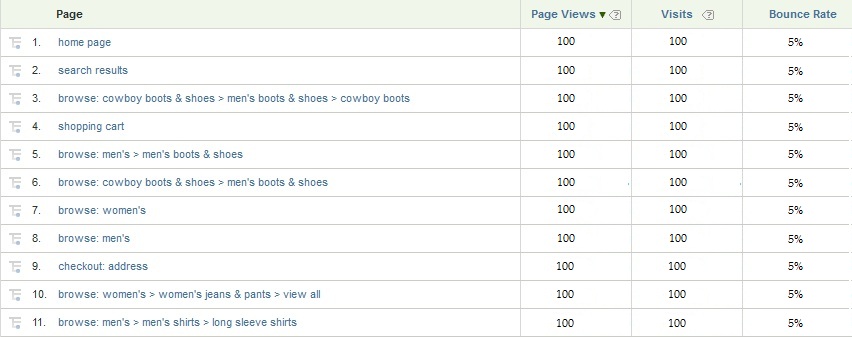 When you run your pages report today, you will (hopefully) see values that are understandable and “friendly” to some degree or another (e.g. “home page”, “category: women’s dresses”, “checkout: purchase complete”, etc.). However, you might also notice a few URLs in your pages report, which is a good sign that something in your implementation needs to be improved. Wait, you say you haven’t seen any URLs in your pages report before? Well, then do this: