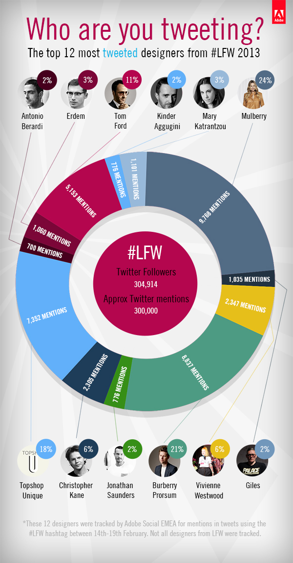 Adobe Social tracked conversations across the web, surrounding twenty designers over the course of London Fashion Week 2013. Check out who were the hottest twelve designers who garnered the most mentions about their work at LFW this year!