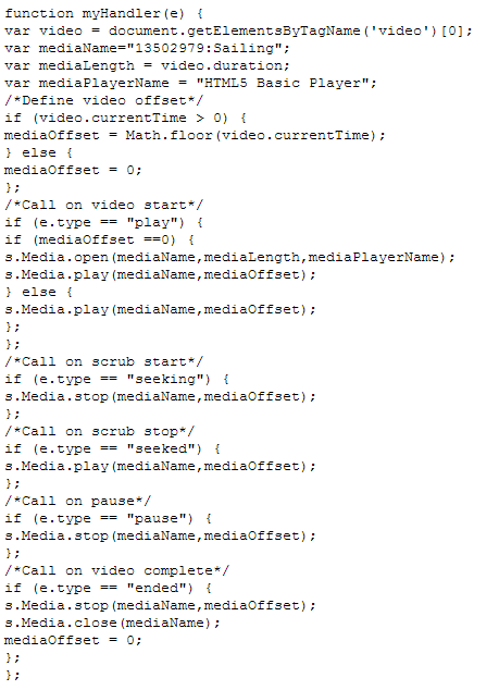 In the previous Flash Video Measurement post, I mentioned a growing trend for Flash players to be Hybrid players, where video playback will occur within Flash when available and fall-back to using an HTML5 video player in environments where Flash is not available. Hybrid players have a very similar implementation to this HTML5 example; however, in the Player Mapping section, a Hybrid player will rely on the JavaScript API code rather than the standard HTML5 JavaScript. Again, your video player developers should provide more documentation describing how to map the player.