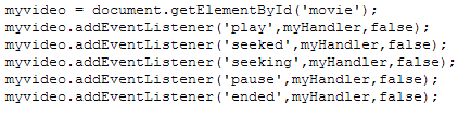 The W3C has defined standards for video events. More information is available here: http://www.w3.org/2010/05/video/mediaevents.html. In my sample player I am looking for play, seeked, seeking, pause, and ended. I have assigned my video player element on the page the id value of “movie”. The chunk of code that looks for the video player events is the following: