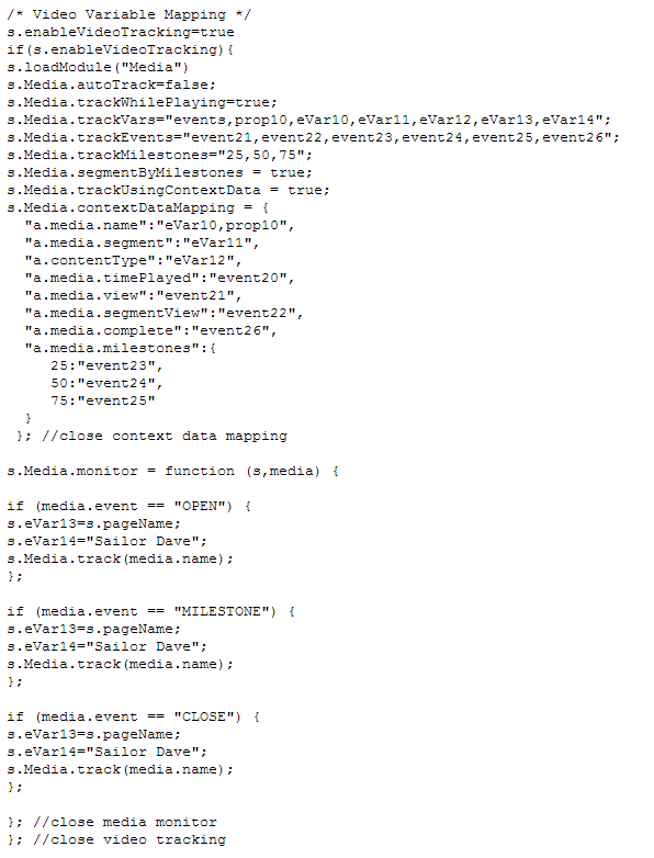 I am not going to cover the measurement plan here, but I strongly encourage you to map out what aspects of video playback you need to capture and select the SiteCatalyst variables you will use before you start modifying your code. A measurement plan will help with implementation and provide documentation into the future.