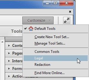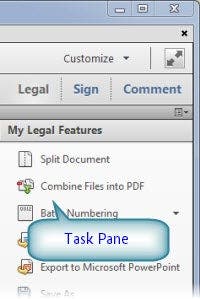 #### Task PaneAcrobat XI allows you to create a custom Task Pane which allows you to include only the tools you need.This is a new feature in Acrobat XI and not available in previous versions of Acrobat X or in Adobe Reader.The custom panel can contain just about any tool available in Acrobat with a few exceptions such as Actions.At right, I’ve created a new Task Pane called Legal which in turn contains a section called My Legal Features.