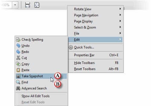 Take Snapshot The Snapshot Tool captures to the clipboard either: – The visible portion of a PDF page – Part of a PDF page