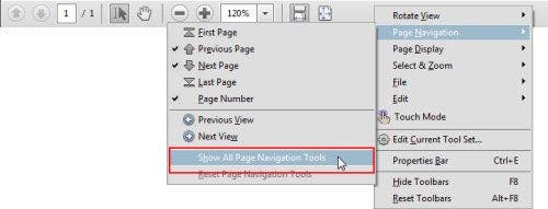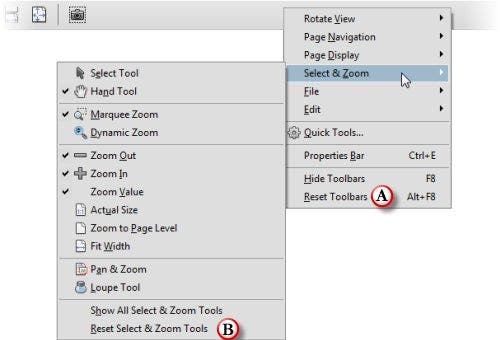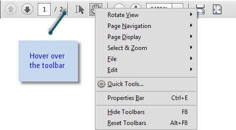 Each of the top menus (Rotate View, Page Navigation, Page Display, Select & Zoom, File, Edit) control which icons will appear on the toolbar..