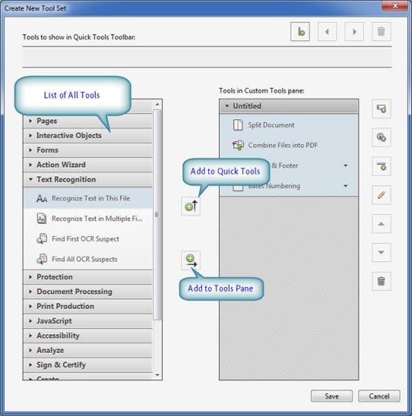 The Customize Tool Set window opens. Choose a tool and add it to either the Quick Tools Toolbar, a Custom Tools pane, or both. For detailed instructions on how to use this window, click here.