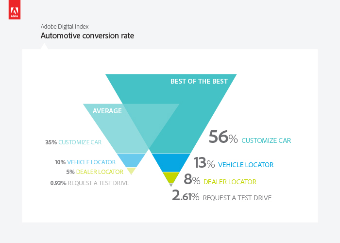 Adobe Digital Index has analyzed 1.1 billion visits to automotive websites, which include 12 of the top 15 automotive manufacturers, to look at how automotive ux is helping to convert online visitors into buyers at the dealer locations. As one would expect, some websites are doing better than others. Those in the top 25% are listed as the “Best of the Best” below.