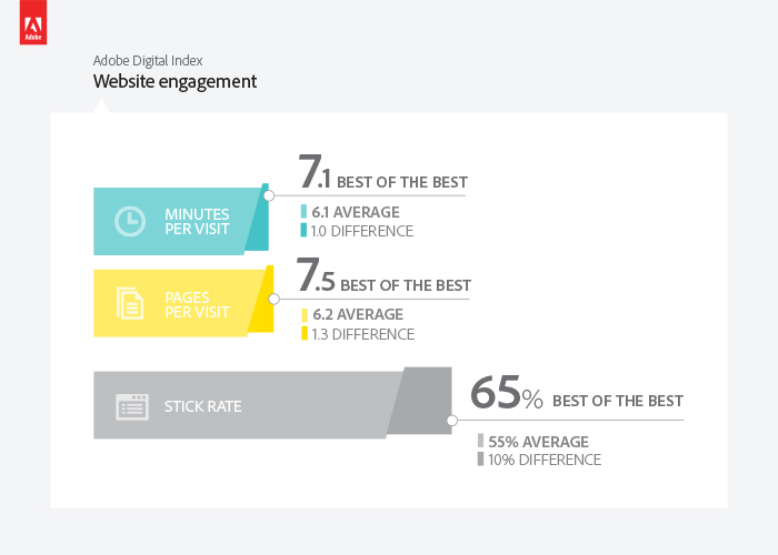 While the automotive companies have been successful in drawing visitors to their websites, they have a short window of time to convince visitors to select a car and physically visit a dealer. Automotive sites are among the lowest in minutes per visit by industry, with only financial services sites scoring lower. Within automotive sites, top performers tend to have more personalized content, leading to greater engagement which enables them to keep visitors a full minute longer than average. Overall, however, the number of pages viewed on automotive websites is among the highest of all industries, with retail being the only industry with more pages viewed.