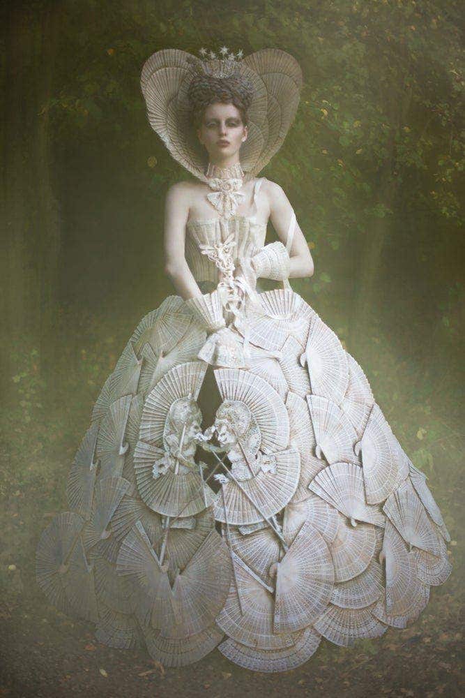 https://blog.adobe.com/media_947b61c3d1aaf381925648fca422f5abde282714.gifHer background working as a fashion designer with those as notable as Alexander McQueen led Kirsty to design and create costumes for each photograph in Wonderland. Her process allows her to blur the lines between fashion and art. For example, the dress in the White Queen photos, including The Twilight Covenant and The Promise Of Home was made of 240 wooden fans that were hand painted and built upon the model on set.