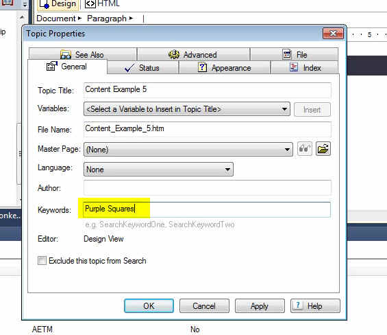 _Stacking the deck: _The demonstration shows how a few mouse clicks enable you to go to a general tab in topic properties and enter relevant keywords that may not occur in the visible text of that topic. Keywords associated with topic properties will take precedence over the number of times a key term is used within text for search rankings.