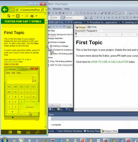 You will find this session very dynamic and easy to grasp. The screen shot below shows HTML5 responsive layout with a live HTML5 video from captivate, indicated in yellow highlighter. RoboHelp displays behind t he web browser.