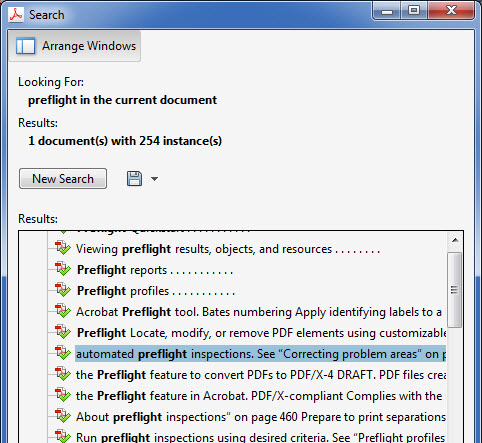 Acrobat will return a contextual hit list of words. Below, I searched for the term “preflight” and found 254 instances in the document.