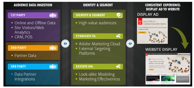 First-party data is typically the foundation for building out an audience for a real-time bidded display advertising campaign—these are the highest performing audiences. An audience or data management platform (DMP) like Adobe Audience Management can ingest first-party Web analytics and offline CRM data and make it available for retargeting.