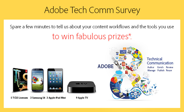 It does not matter if you use Adobe products or not. As long as you are a Tech Comm professional and want your voice to be heard, here is your chance. Please spare 20 minutes of your precious time to fill out the survey and stand a chance to win one of the 20 exciting prizes!