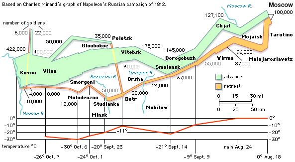 The image depicts much more than just the route; the juxtaposition of the outside temperature, number of troops, and distance and location by date tell a grim tale of that tragic invasion. The blue line illustrates the advance of Napoleon’s Grand Army as they invaded Russia in June of 1812. Only 25 percent of the corps made it to Moscow; many were lost or perished along the way. The departure from Moscow (beige route) saw further reductions in the numbers, which correspond to onset of winter in Russia and the brutally extreme temperatures that diminished the French army to a mere 10,000 survivors over the course of six months.
