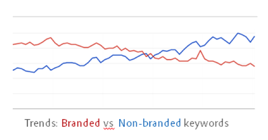 Changes in search patterns can influence SEO and overall business content strategy. For example, a shift in search trends from branded terms (keywords that include the company or product name) to nonbranded keywords suggests the creation and optimization of content focused on themes built around these new search terms; for example, topics about specific product features and functionalities.