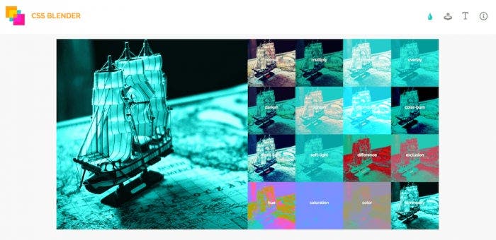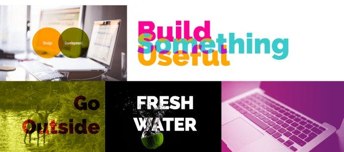 You can also blend text with other text, allowing you to achieve nice colourful text overlapping effects like the one shown in the top right corner of the following image. All of the effects shown in this image can be achieved using different CSS blend modes.