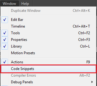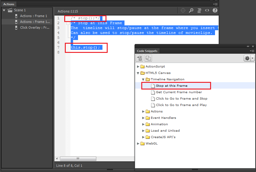 - Replace the ActionScript code commented out as reference in the actions panel with their HTML5 Canvas equivalents. You can use the HTML5 Canvas code snippets panel (Window > Code Snippets) in Flash CC 2015 to get started.