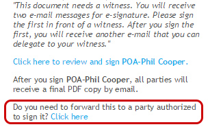Moments later, Roger receives the first Please eSign e-mail, which he e-signs in front of a witness by selecting the “Click here to review and sign” link in the message. After Roger signs the document, he will receive a second e-mail. To obtain a witness’ signature, Roger clicks the link following the message Do you need to forward this to a party authorized to sign it? in his e-mail.