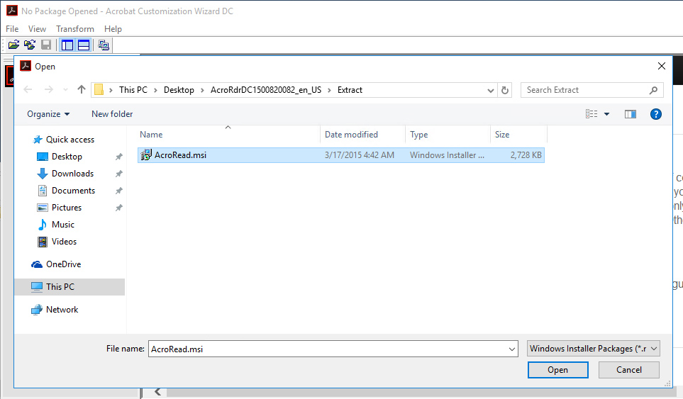The Acrobat Customization Wizard DC makes it easy to customize the Reader installer up front, before you try to install the software. Even if you aren’t going to virtualize the product with App-V, it is well worth the effort to customize the installer before you distribute. Just be sure to get the copy for the version of Reader that you intend to sequence.