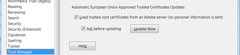 Following the approval of the law on July 2014, Adobe has been working on the integration of the EUTL in Acrobat – as previously discussed in this blog post – and has released the feature in versions DC and XI. In these releases, you may have noticed a new user preference to manage the download of the European trusted list and its automatic update.