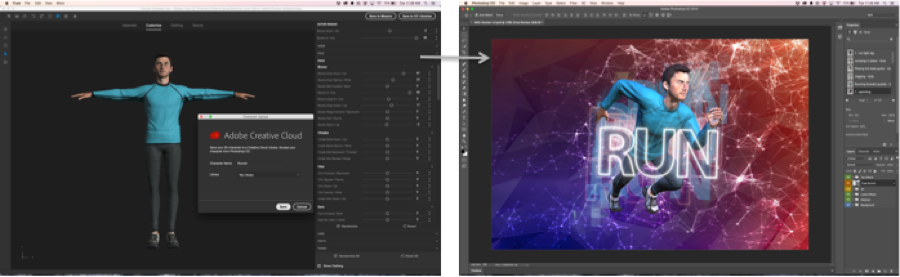 Save your 3D characters directly to your CC Library and access them in Photoshop by simply dragging them into your document. Use the updated 3D Properties panel in Photoshop to choose from thousands of poses and animations to apply to your character. With this new workflow you can:
