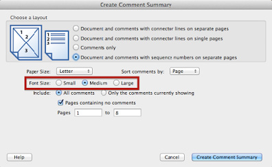 The Create Comment Summary dialog box gives you a variety of options to suit your needs. You can choose between four different layouts of how you want your comments displayed. You can even choose how large you want the font size of your comments to be.