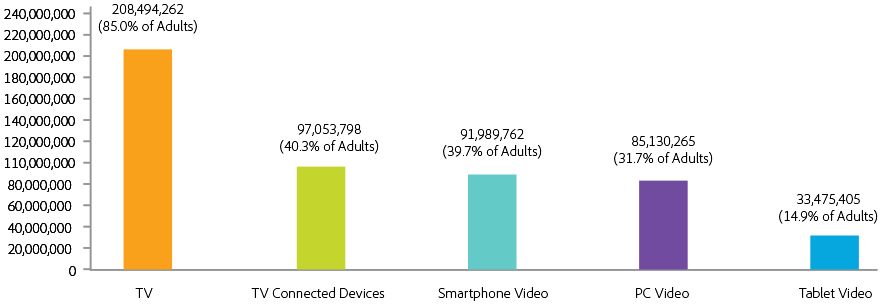 To measure how many people engage with TV programming is to measure reach. Reach accounts for the number of people that watch in a given period of time. Figure 1 shows that 85.0% of the adult population can be reached with TV, 40.3% with TV connected devices, 39.7% with PC video, 31.7% with smartphone video, and 14.9% with tablet video. These numbers are important because they provide an upper end ballpark for how many people per week could watch any given show on each screen.
