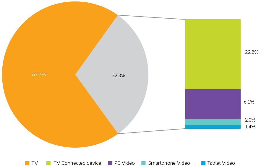 In the U.S., time spent viewing TV is still larger than time spent with all other video viewing vehicles combined. According to Nielsen, TV delivered 458 billion minutes of viewing during an average week in July 2015 versus 77 billion minutes of viewing across all connected devices during the same period. However, growth in device ownership and viewing behaviors on connected devices may quickly change the viewing landscape.