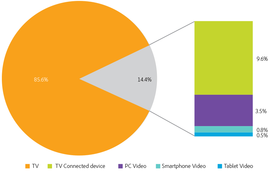 Before Apple TV and Roku brought premium video to the living room in a big way, viewing time on connected devices was a miniscule sliver of the overall viewing pie. By 2014, this sliver grew to command a double digit percentage share of viewing time.