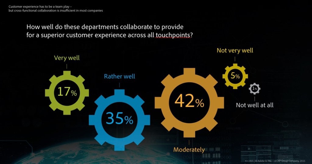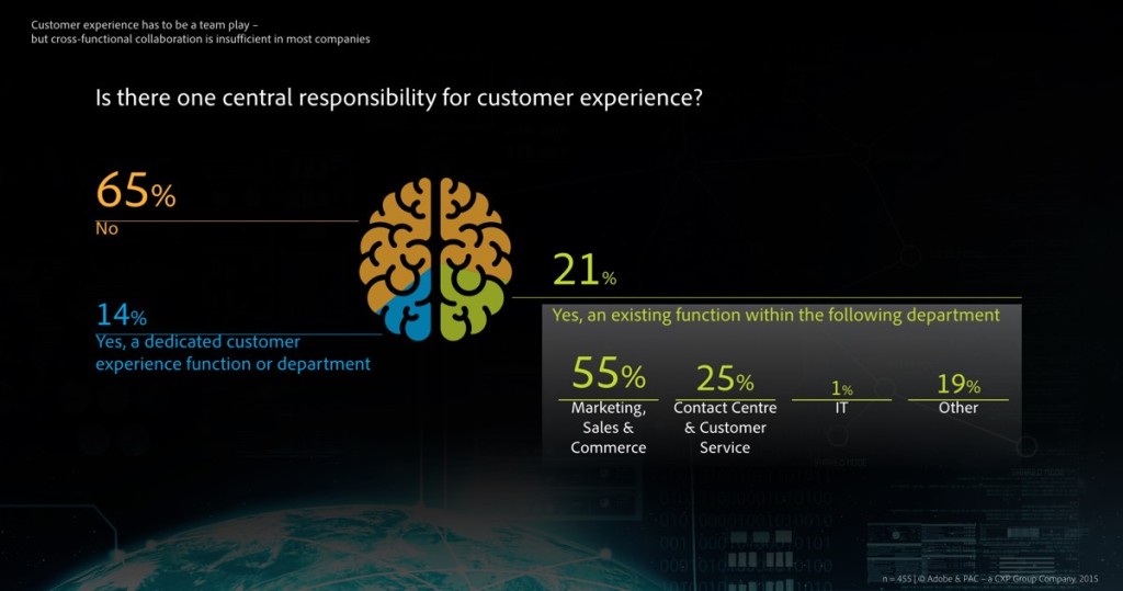 Individual fields of work must collaborate within a smoothly organised and well-oiled structure in order for an interdisciplinary strategy to take hold. But the answers given by half of the study participants indicate this remains a problem. Collaboration between the departments to produce a holistic customer focus is persistently inefficient. 65 percent of the companies do not have a central position responsible for this area, tasked with ensuring a uniform customer experience across all touchpoints.