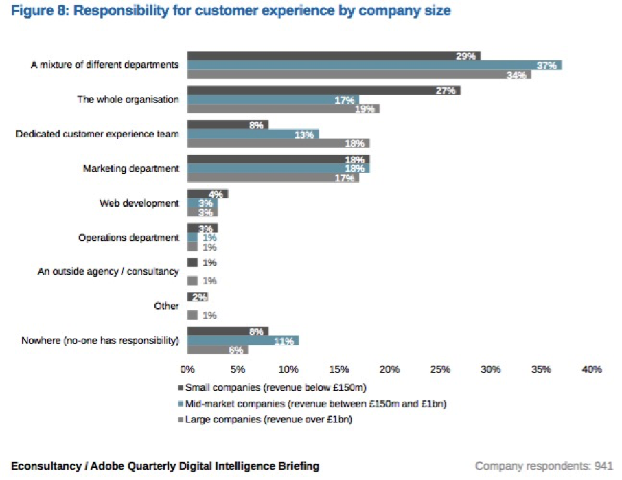 In its second study regarding digital transformation, the CCS consulting firm interviewed more than 150 brand managers. Their results show that 93% of respondents see digital as a tool to reinvent customer experience. It is then clear that everybody agrees on the subject. The problem is that the customer experience is a vague concept, as demonstrated by the results of the study The CX Challenge of E‑Consultancy: on average, nearly a third of respondents believe that the responsibility for customer experience is shared across departments, which is like saying it is nobody’s responsibility!