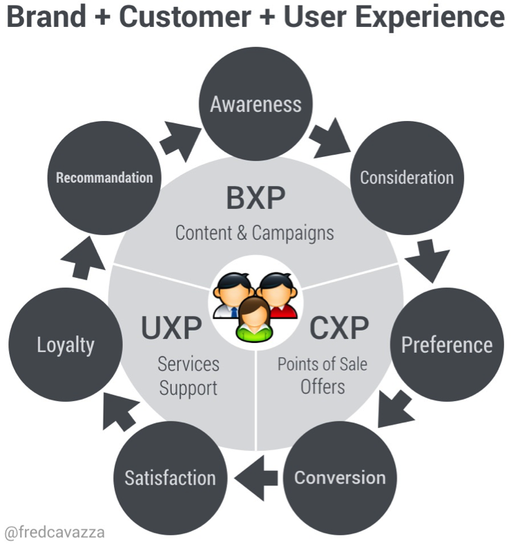 - The Brand experience (BXP), that affects campaigns and content aiming at increasing the brand visibility and attracting prospective customer’s attention;