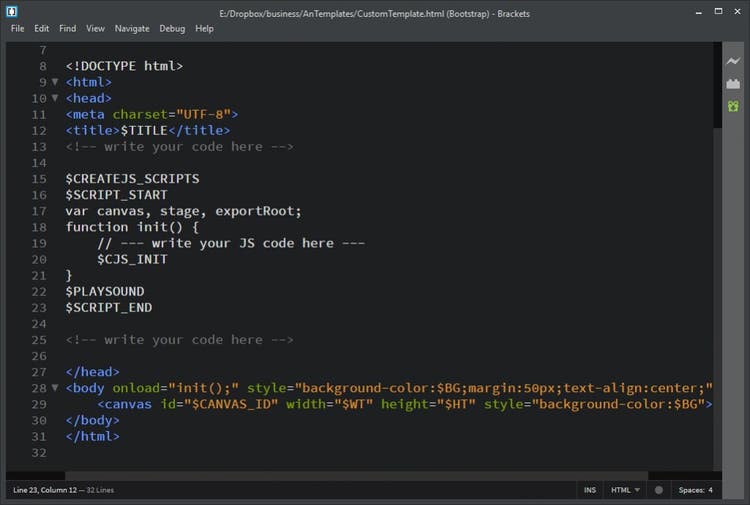 With the default template exported, you will now be able to open it up in Adobe Dreamweaver, Brackets, or any text editor of your choosing to customize the HTML, JavaScript, and CSS contained within. Perhaps you want to center your HTML5 Canvas content or add other elements like headers and descriptive text. This is all possible using Templates.