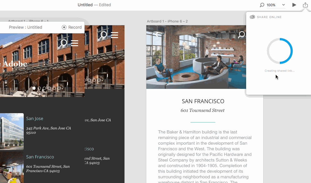 We have also added hotspot hinting to the shared prototypes on the web. If a viewer of a prototype clicks on an area of the screen with no interactions, they will see a rectangle highlighting the areas of a screen that someone can click. This should make prototypes more usable. In the future, we will add options to turn this highlighting of hotspots on and off.