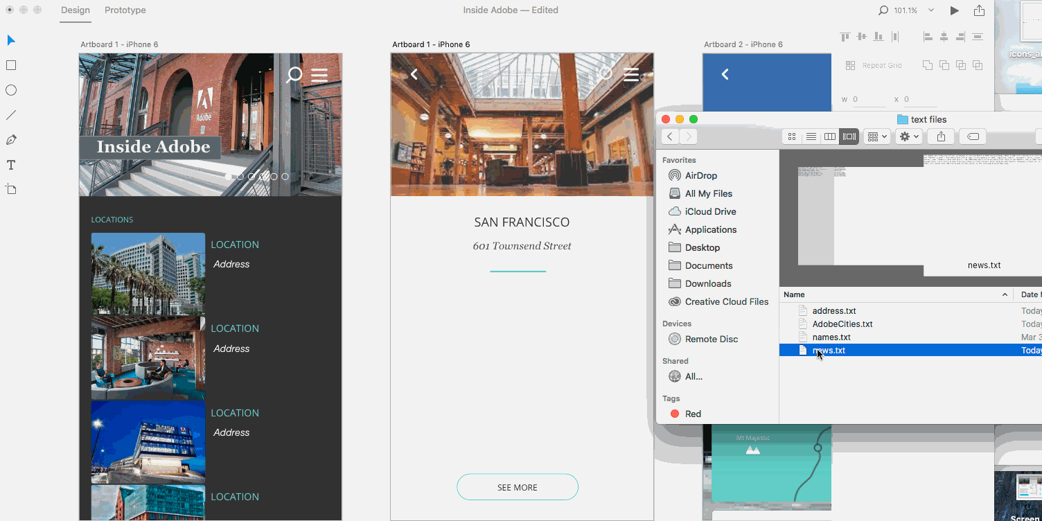 Further, you can drag plain text files into XD designs to immediately create an area text or populate the text controls of a Repeat Grid. This method of adding custom text to a Repeat Grid should save a lot of time and maintenance of content.