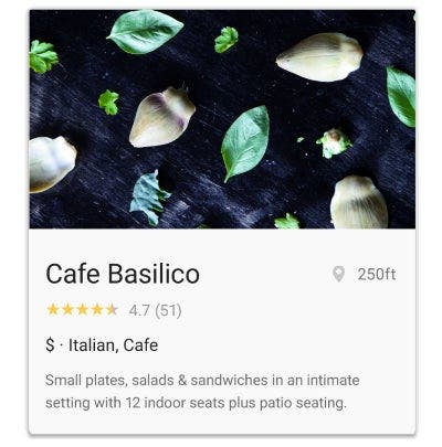 The most important thing about cards is that they are almost infinitely manipulatable. They are a good choice for responsive design since cards act as content containers that can easily scale up or down. This feature allows us to create a single aesthetic across multiple devices, and to establish a consistent experience regardless of device.