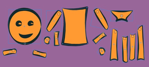 In this example, we draw out each of these shapes with the tools available to us within Animate. One by one, convert each shape to a Movie Clip symbol by selecting it and choosing Modify > Convert to symbol from the application menu. Provide a useful name for each symbol and be sure to have Movie Clip as the symbol type. Hit OK for each and you’ll have an assortment of parts to build your armature from.