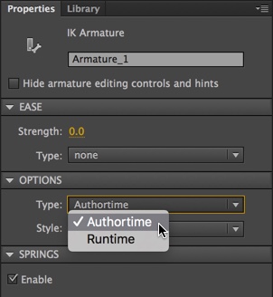 Whether building an armature from a shape or set of symbol instances, the option exists to use the armature as a “runtime” armature. What this means is that poses can be dynamically set at runtime by the user through interaction with the armature. To select this option, select any frame upon the armature layer and change it from the Properties panel.