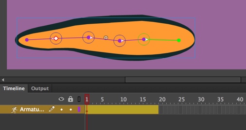 With the armature created, all you need to do in order to design the animation is to extend the frames across the Timeline and change the pose across different frames. Poses within an armature layer are created in a similar way that keyframes are created in a Motion Tween. You simply move the playhead to the frame you’d like to create a new pose at – and make adjustments to the position of your armature.
